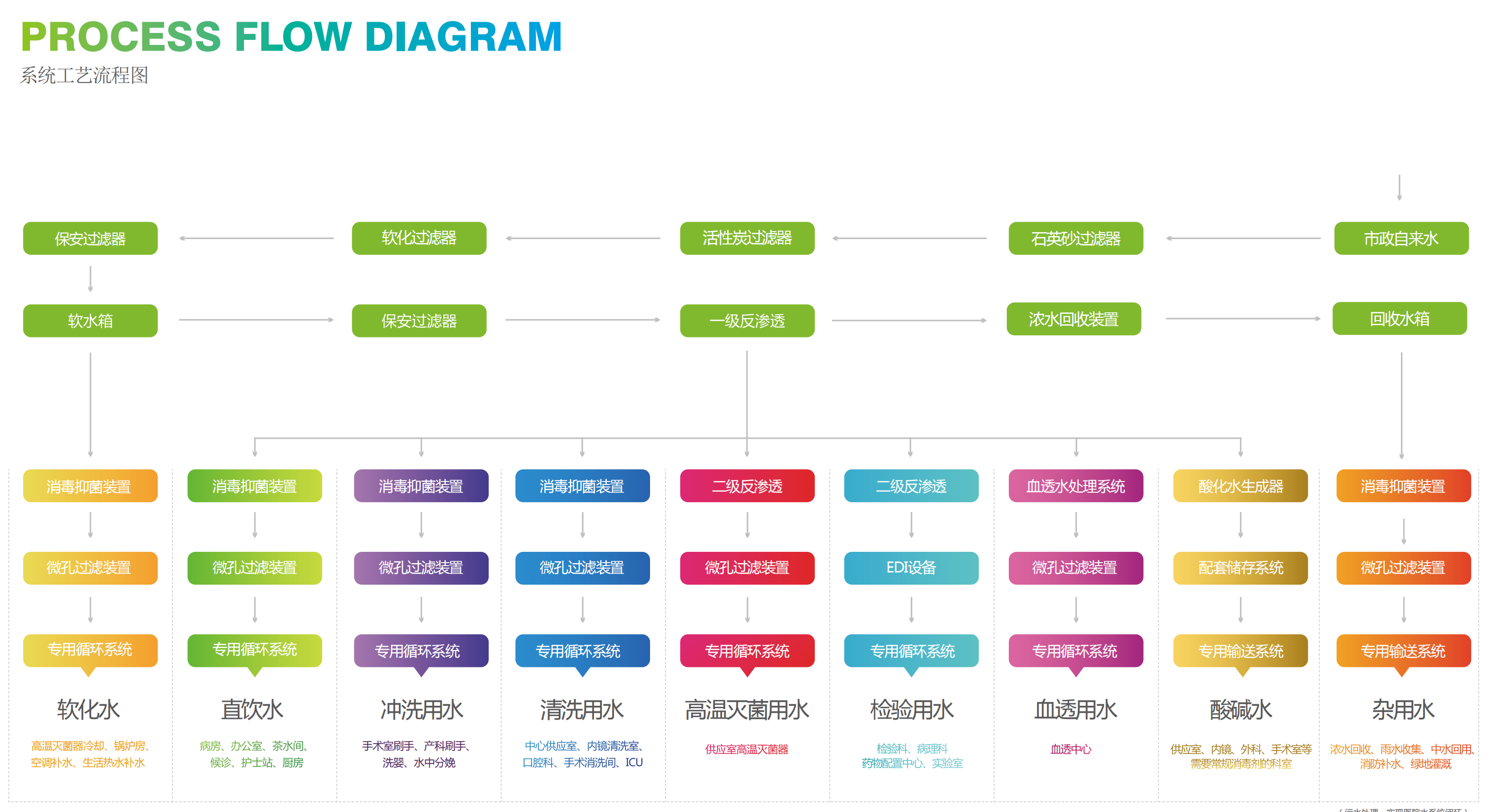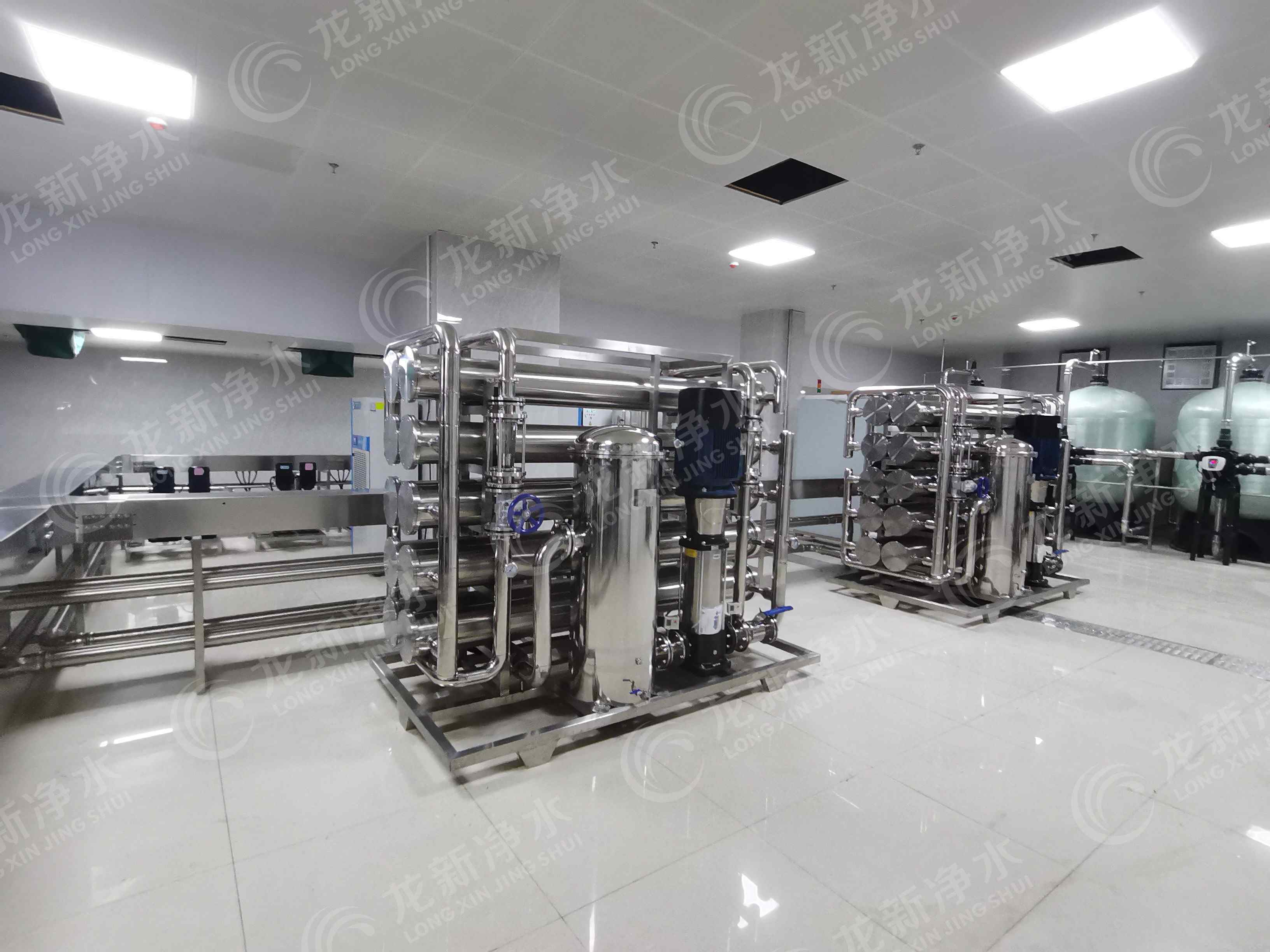 該項目龍新凈水根據醫院不同科室使用的水質要求,先采用二級反滲透技術,再采用后續處理如EDI和超濾技術等。把按科室需要的純水通過專用不銹鋼管網輸送到檢驗科、病理科、手術室、消毒供應中心、血透室、內鏡中心等。達到水資源綜合利用,節水節電,減少醫療設備用房,提高醫院信息化管理水平和效益。